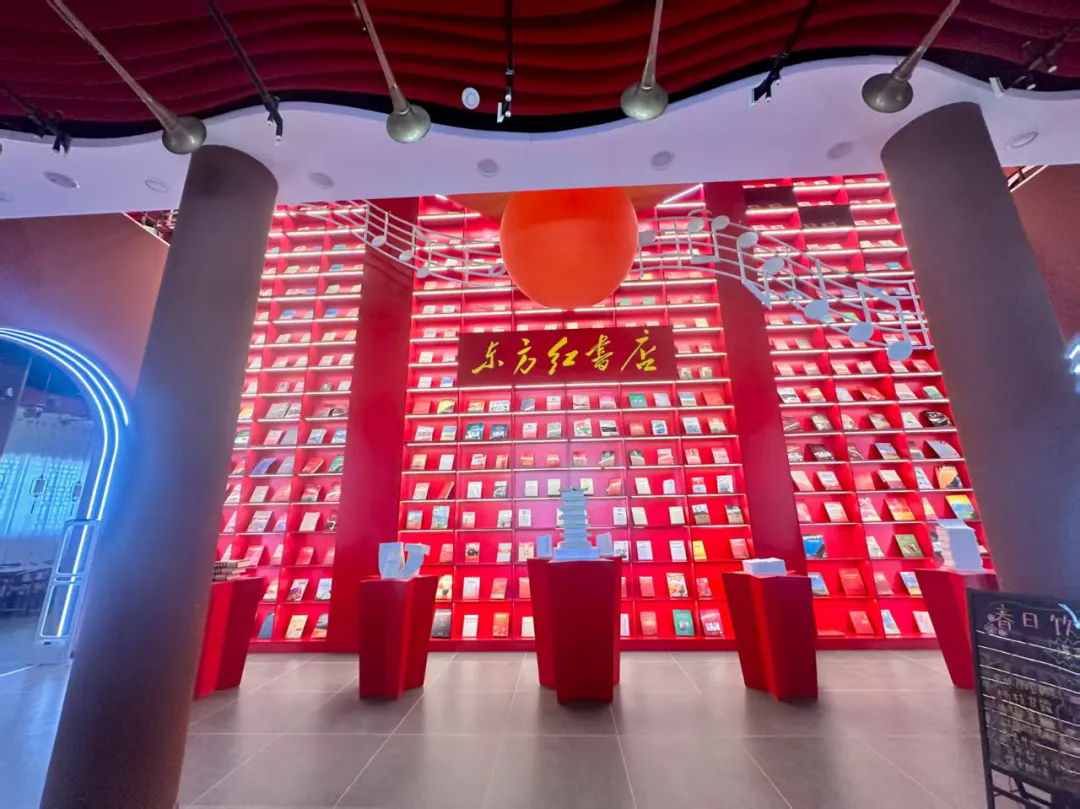 中午,踏入东方红产业园区,实践队首先来到园区内的标志性建筑东方红阁。这座红墙黛瓦、飞檐翘角的楼阁,与园区里的东方红书店相融共生。步入书店,巨型《东方红》乐谱艺术装置从天花板倾泻而下,红色书架如阵列般铺开,满墙红歌乐谱、陈列的陕北乐器,生动铺陈出《东方红》从陕北民歌到时代颂歌的跨越轨迹。队员们触摸着带有岁月温度的乐谱与乐器,沉浸式感受红色文化脉络,同时,他们也细致记录建筑细节,认真收集素材。