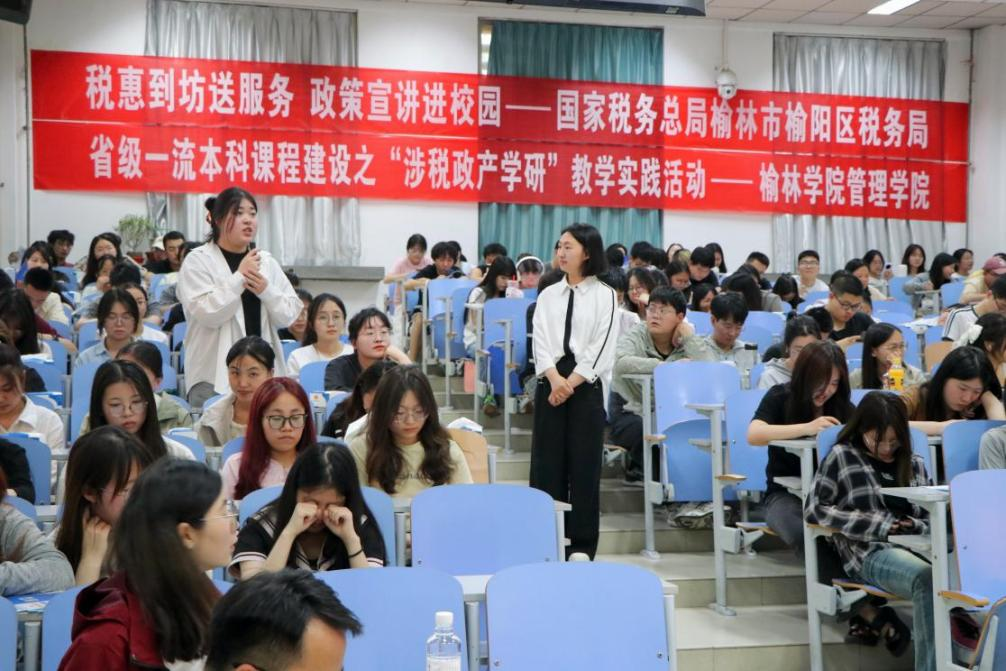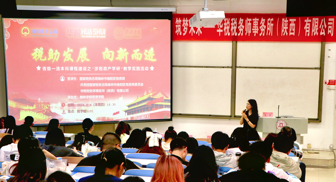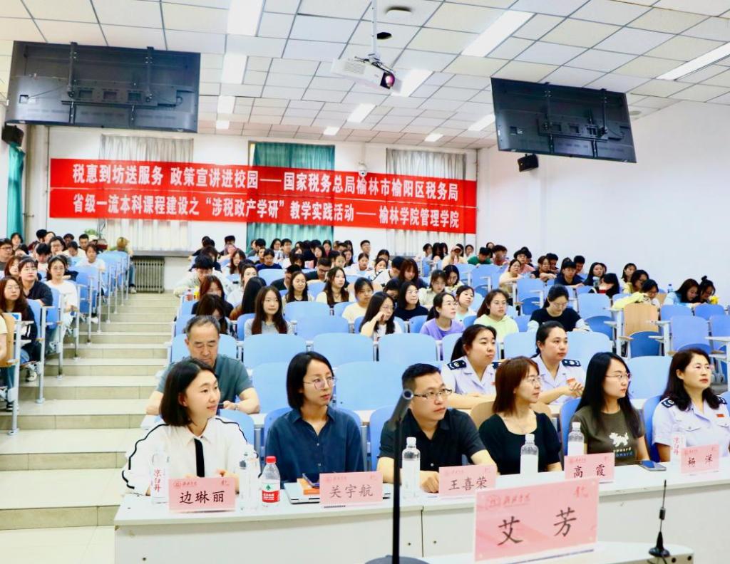 出席此次宣讲活动的嘉宾包括:国家税务总局榆林市榆阳区税务局纳税服务股股长陈延利、科员田改男、陕西省税务师协会榆林市基层联络处主任杨建国、意昂体育会计教研室主任王喜荣、财务管理教研室主任高霞、财会专业骨干教师关宇航以及陕西省一流本科课程教学团队负责人边琳丽、团队成员杨洋。此外,21级财务管理和会计学专业、23级财会专升本的全体员工也踊跃参与,共同见证了这一教育盛会。
